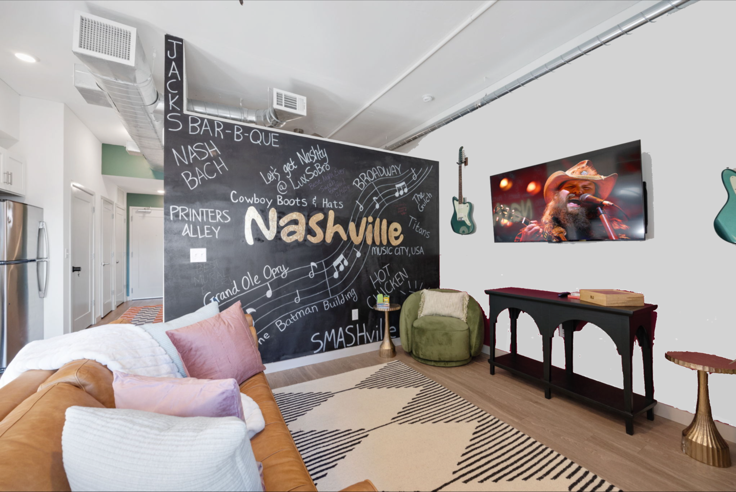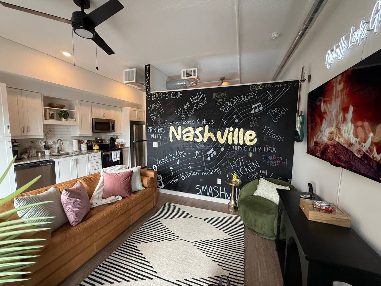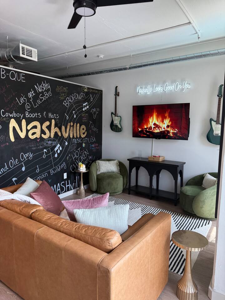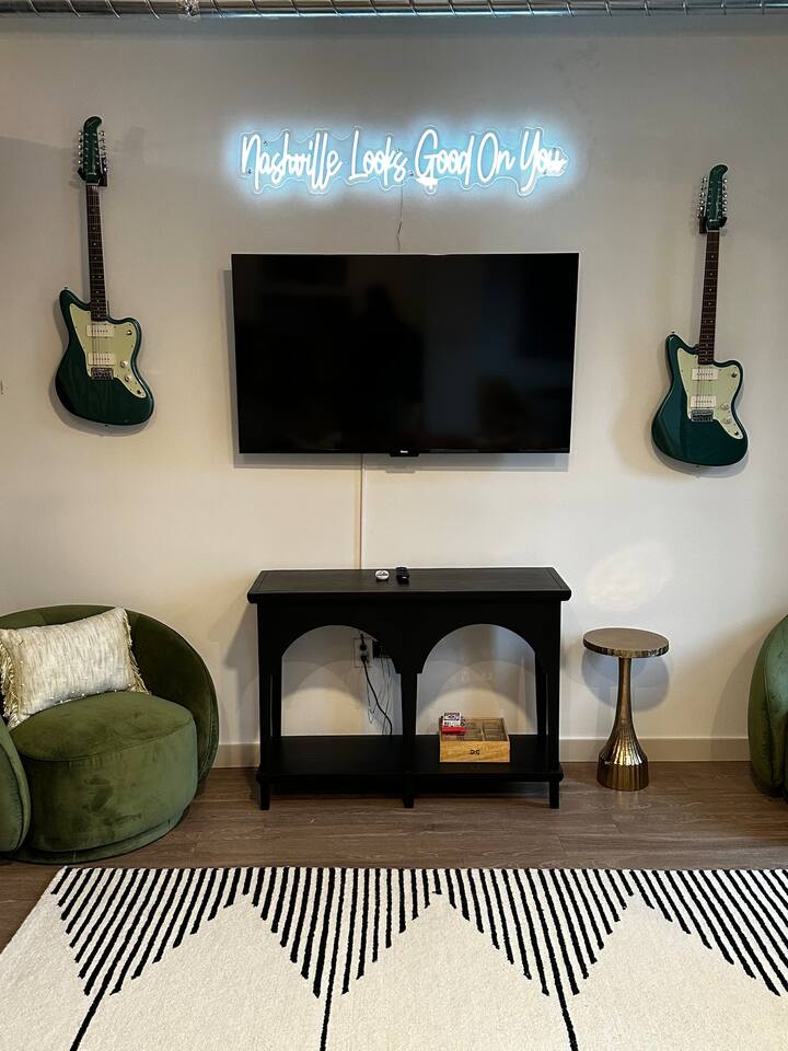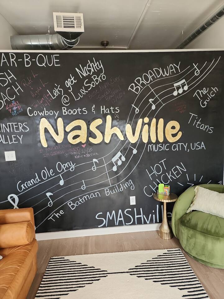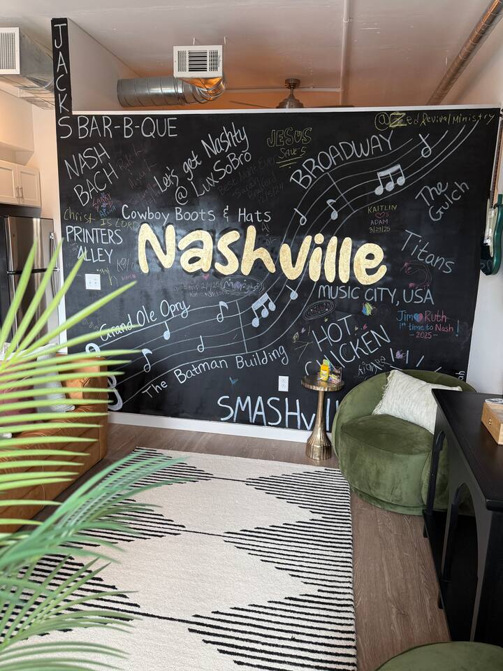 ✨ THE SPACE Location location! Just 3 blocks from Broadway. Designed to blend modern elegance with Southern charm, this thoughtfully curated loft delivers both comfort and character. 🛏 Sleeping Arrangements • 1 luxurious bedroom with a plush king bed • 1 queen sleeper sofa in the living room • Comfortably sleeps 4 guests The bedroom is a playful tribute to all things Nashville, featuring crisp linens and cozy touches to ensure a restful night’s sleep after exploring the city. 🛋 Living & Entertainment • Cozy living room with sleeper sofa + flat screen TV • Vinyl record player with assorted records • Floor-to-ceiling windows with panoramic Music City views • Chalkboard feature wall — perfect for selfies and leaving your Nashville story Relax after a day on Broadway, stream your favorite shows, or spin classic country vinyl while soaking in the skyline views. The energy of Nashville flows right through the space. • Wheelchair accessible with no stairs, same level living. 🍳 Kitchen & Dining • Full kitchen with stainless steel appliances • Pub-style dining table with plush barstools • Coffee on your private balcony overlooking the pool Whether you're preparing a quick breakfast or evening cocktails, the kitchen blends upscale design with modern convenience. 🌆 RESORT-STYLE AMENITIES Enjoy access to premium shared amenities throughout the building: • Saltwater pool • Sky lounge • Fitness center • In-unit washer + dryer • Safe, secure building just steps from Broadway Kosho (Japanese cuisine) and Tipsy Scoops located on the lower level — perfect for dinner or a late-night treat without leaving the building. 📍 LOCATION, LOCATION, LOCATION You truly cannot beat this spot. • 3 blocks to Broadway’s live music scene • Steps to Bridgestone Arena • Walkable to the Ryman Auditorium • Minutes to Nissan Stadium Experience Nashville the way it’s meant to be — on foot, immersed in music, food, and nightlife. 🚗 PARKING • Designated building parking available for $30 per night 📝 IMPORTANT DETAILS ✅ This property has special local compliance requirements which include a signed rental agreement, ID verification, and a security hold of $1000 (which is not a traditional security deposit, just a pending transaction). As an optional alternative to the security hold, you may opt in to purchase a non-refundable damage waiver provided by a third-party insurance company. The optional damage waiver is $49 for stays up to 10 nights, with an additional $1.50 per day for stays longer than 10 nights. Damage waiver purchases are optional. To make this process easy for you, we use a secure and very simple, app-free platform called Happy Guest. It is not an app, and you do not have to sign up for an account - it’s a safe and secure website. It also gives you a guest portal with all the info about the home and all of my favorite local spots. Your guest portal includes advertisements with third-party upgrades that you may want to enhance your stay. These upgrades are optional and include: Late Check out - 1 Hour - $25 If you have any questions, just message us anytime! Happy to help!