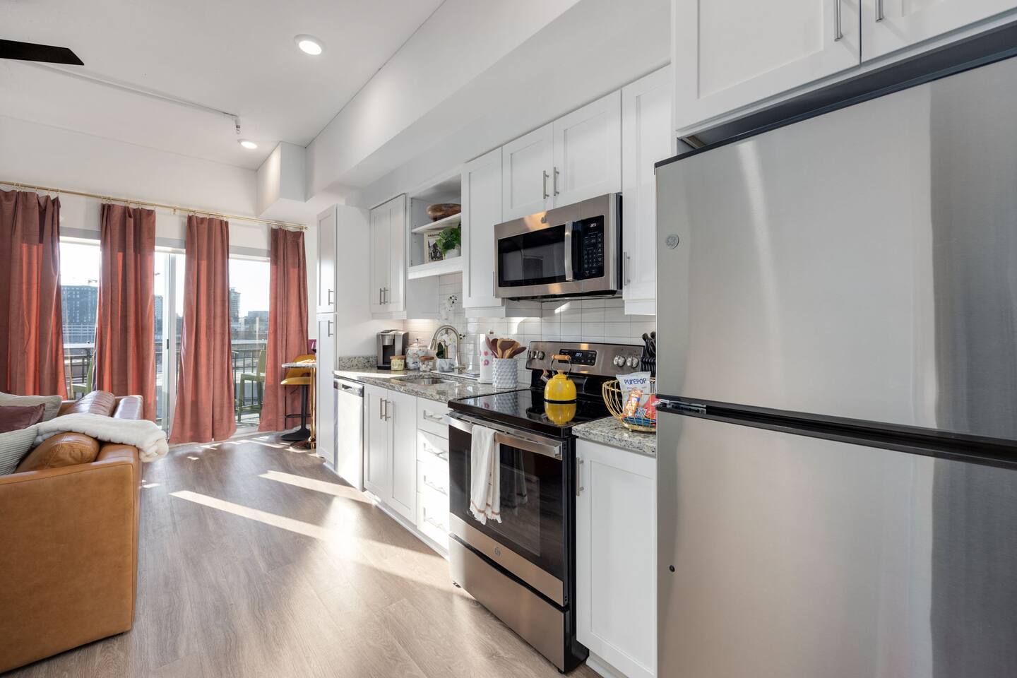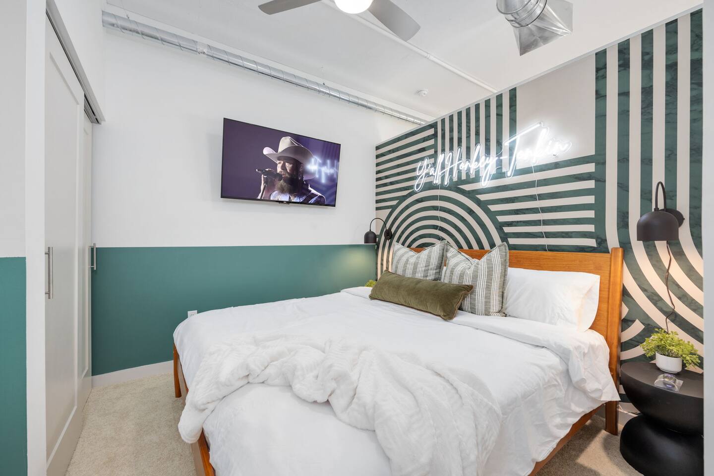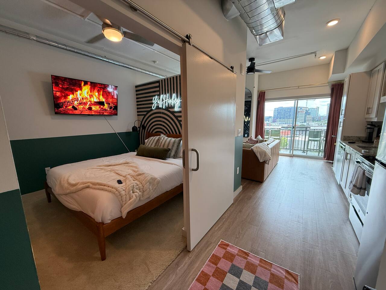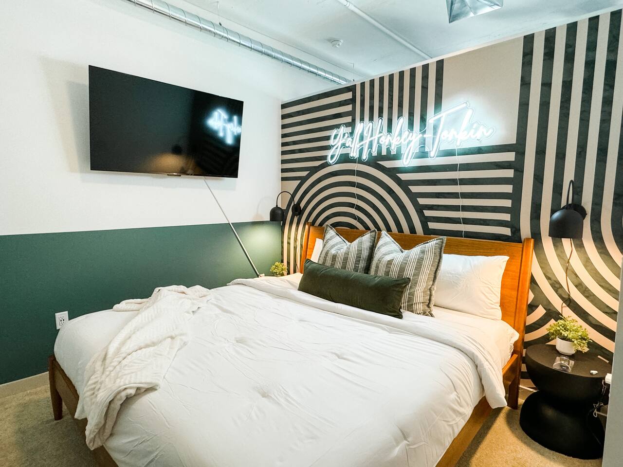 ✨ THE SPACE Location location! Just 3 blocks from Broadway. Designed to blend modern elegance with Southern charm, this thoughtfully curated loft delivers both comfort and character. 🛏 Sleeping Arrangements • 1 luxurious bedroom with a plush king bed • 1 queen sleeper sofa in the living room • Comfortably sleeps 4 guests The bedroom is a playful tribute to all things Nashville, featuring crisp linens and cozy touches to ensure a restful night’s sleep after exploring the city. 🛋 Living & Entertainment • Cozy living room with sleeper sofa + flat screen TV • Vinyl record player with assorted records • Floor-to-ceiling windows with panoramic Music City views • Chalkboard feature wall — perfect for selfies and leaving your Nashville story Relax after a day on Broadway, stream your favorite shows, or spin classic country vinyl while soaking in the skyline views. The energy of Nashville flows right through the space. • Wheelchair accessible with no stairs, same level living. 🍳 Kitchen & Dining • Full kitchen with stainless steel appliances • Pub-style dining table with plush barstools • Coffee on your private balcony overlooking the pool Whether you're preparing a quick breakfast or evening cocktails, the kitchen blends upscale design with modern convenience. 🌆 RESORT-STYLE AMENITIES Enjoy access to premium shared amenities throughout the building: • Saltwater pool • Sky lounge • Fitness center • In-unit washer + dryer • Safe, secure building just steps from Broadway Kosho (Japanese cuisine) and Tipsy Scoops located on the lower level — perfect for dinner or a late-night treat without leaving the building. 📍 LOCATION, LOCATION, LOCATION You truly cannot beat this spot. • 3 blocks to Broadway’s live music scene • Steps to Bridgestone Arena • Walkable to the Ryman Auditorium • Minutes to Nissan Stadium Experience Nashville the way it’s meant to be — on foot, immersed in music, food, and nightlife. 🚗 PARKING • Designated building parking available for $30 per night 📝 IMPORTANT DETAILS ✅ This property has special local compliance requirements which include a signed rental agreement, ID verification, and a security hold of $1000 (which is not a traditional security deposit, just a pending transaction). As an optional alternative to the security hold, you may opt in to purchase a non-refundable damage waiver provided by a third-party insurance company. The optional damage waiver is $49 for stays up to 10 nights, with an additional $1.50 per day for stays longer than 10 nights. Damage waiver purchases are optional. To make this process easy for you, we use a secure and very simple, app-free platform called Happy Guest. It is not an app, and you do not have to sign up for an account - it’s a safe and secure website. It also gives you a guest portal with all the info about the home and all of my favorite local spots. Your guest portal includes advertisements with third-party upgrades that you may want to enhance your stay. These upgrades are optional and include: Late Check out - 1 Hour - $25 If you have any questions, just message us anytime! Happy to help!